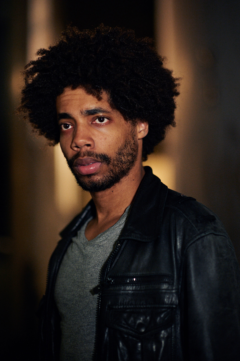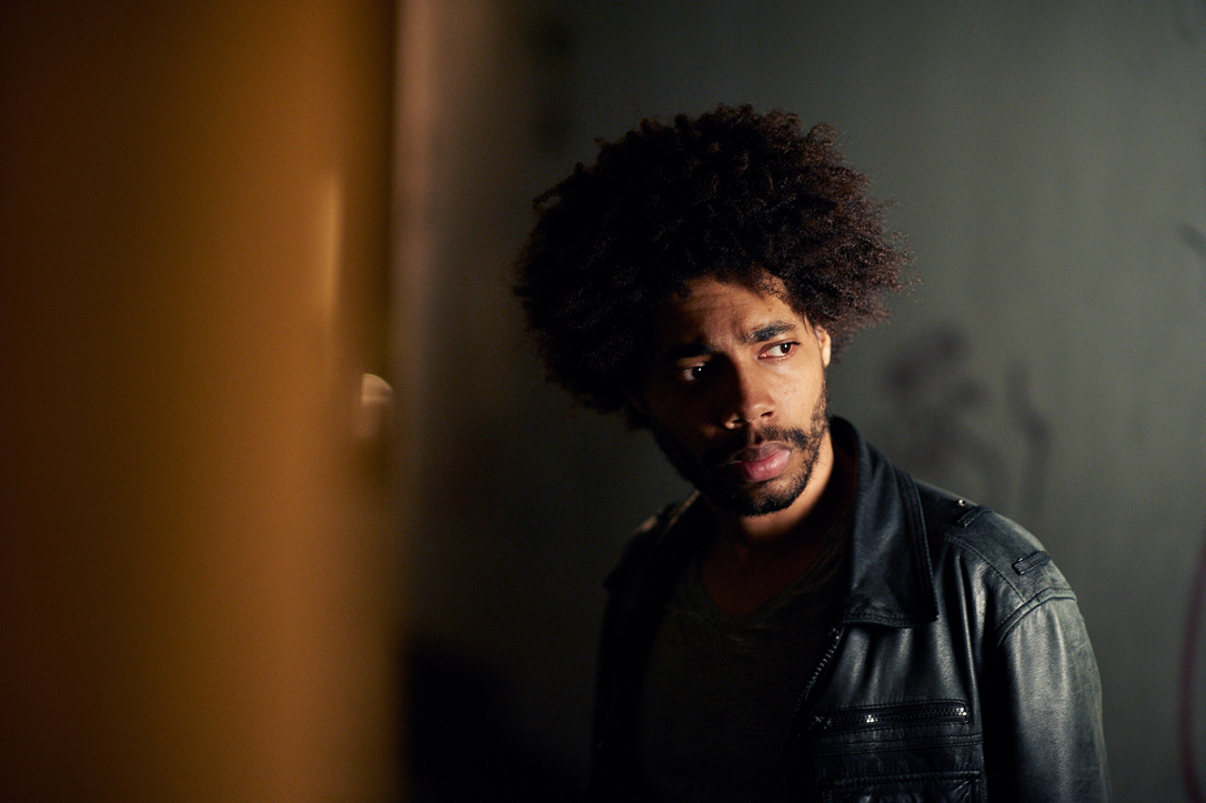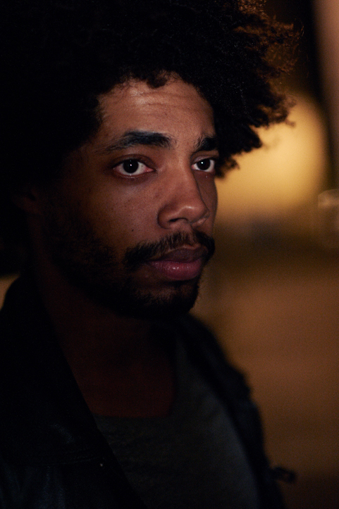 - A person with curly hair and a beard is wearing a leather jacket, looking sideways in a dimly lit environment with a blurred foreground.