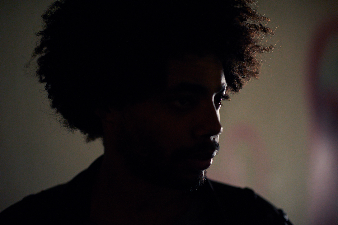 - A person with curly hair and a beard is looking slightly away from the camera. The lighting is dim and the background is blurred, creating a focused portrait effect.