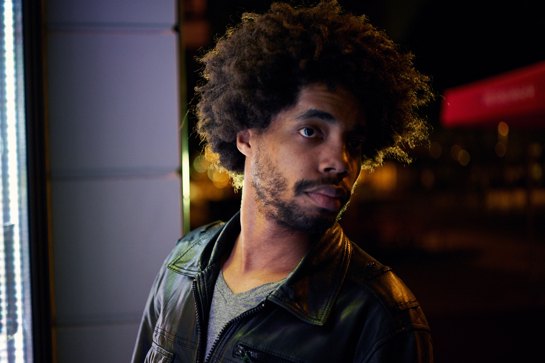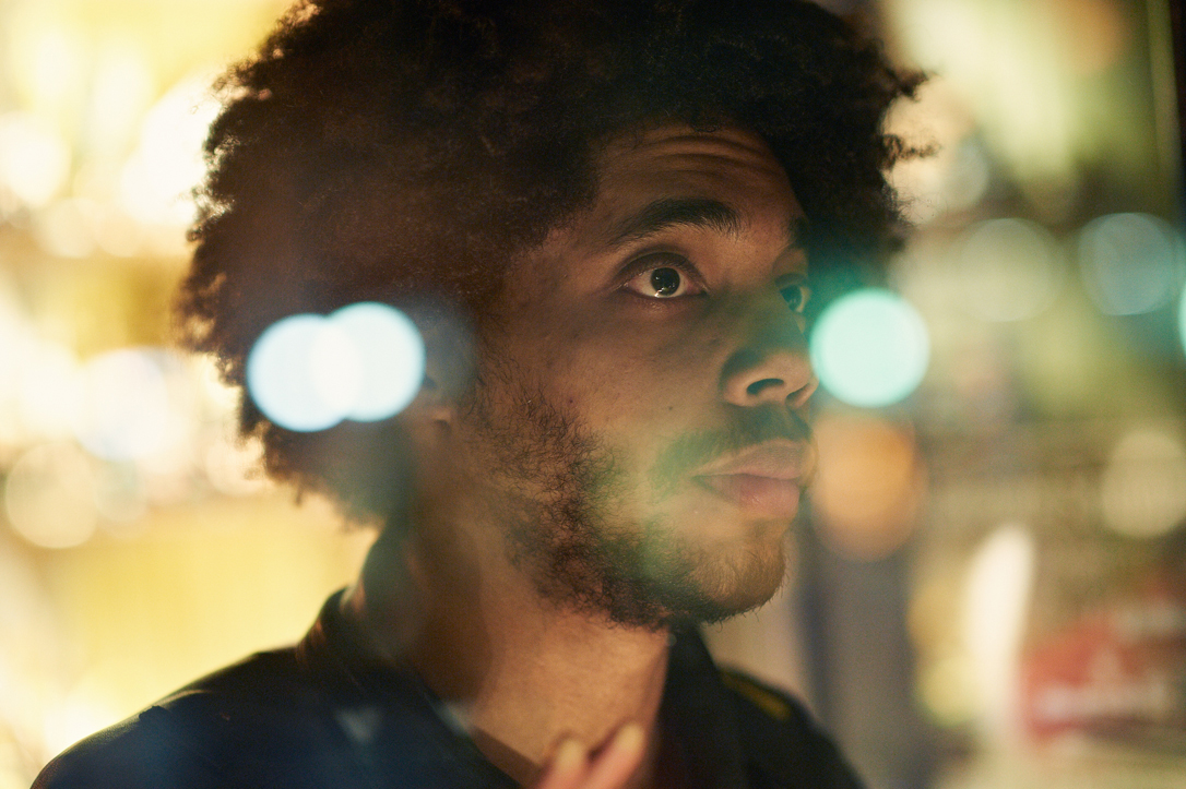 - A person with curly hair and facial hair is captured in a close-up shot at night. The background features colorful blurred lights, adding a bokeh effect. The person’s gaze is directed off-camera.
