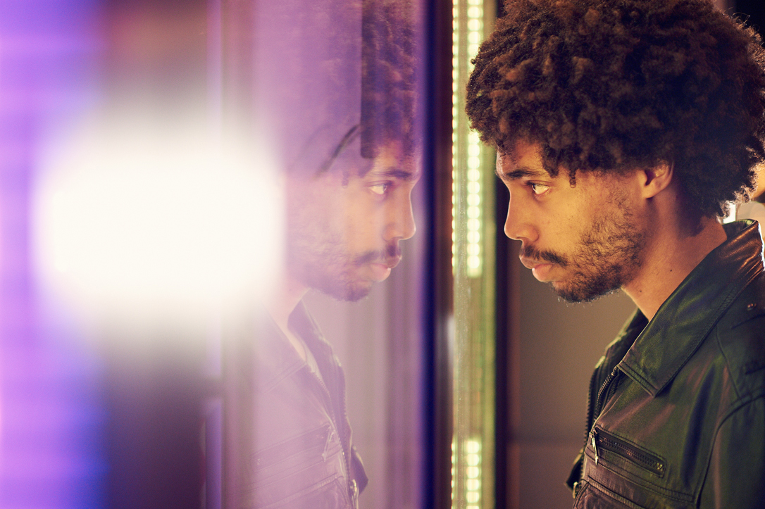 - A man with curly hair and a beard is looking at his reflection in a mirror, illuminated by bright, colorful lighting. He is wearing a jacket, and the scene suggests a thoughtful or introspective moment.