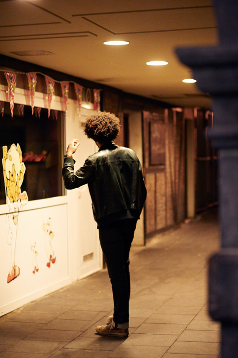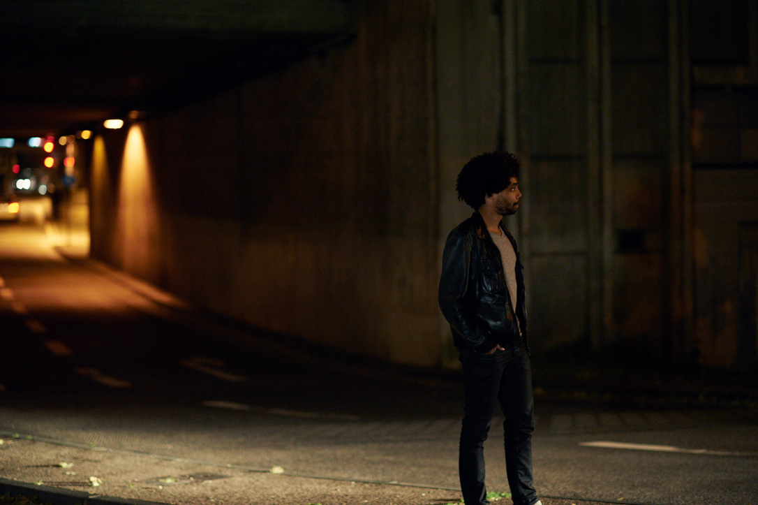 - A person with curly hair is wearing a leather jacket and standing in a dimly lit alley. A streetlight illuminates the background, casting soft shadows along the narrow passageway.