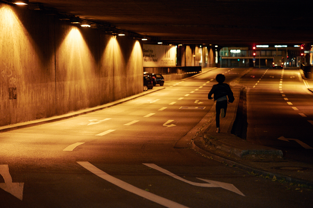 - A person is running in a dimly lit tunnel with multiple lanes marked by arrows. The tunnel walls have a concrete texture, and several vehicles are parked along the side. The ambiance is illuminated by overhead lights, creating a warm glow on the road surface.