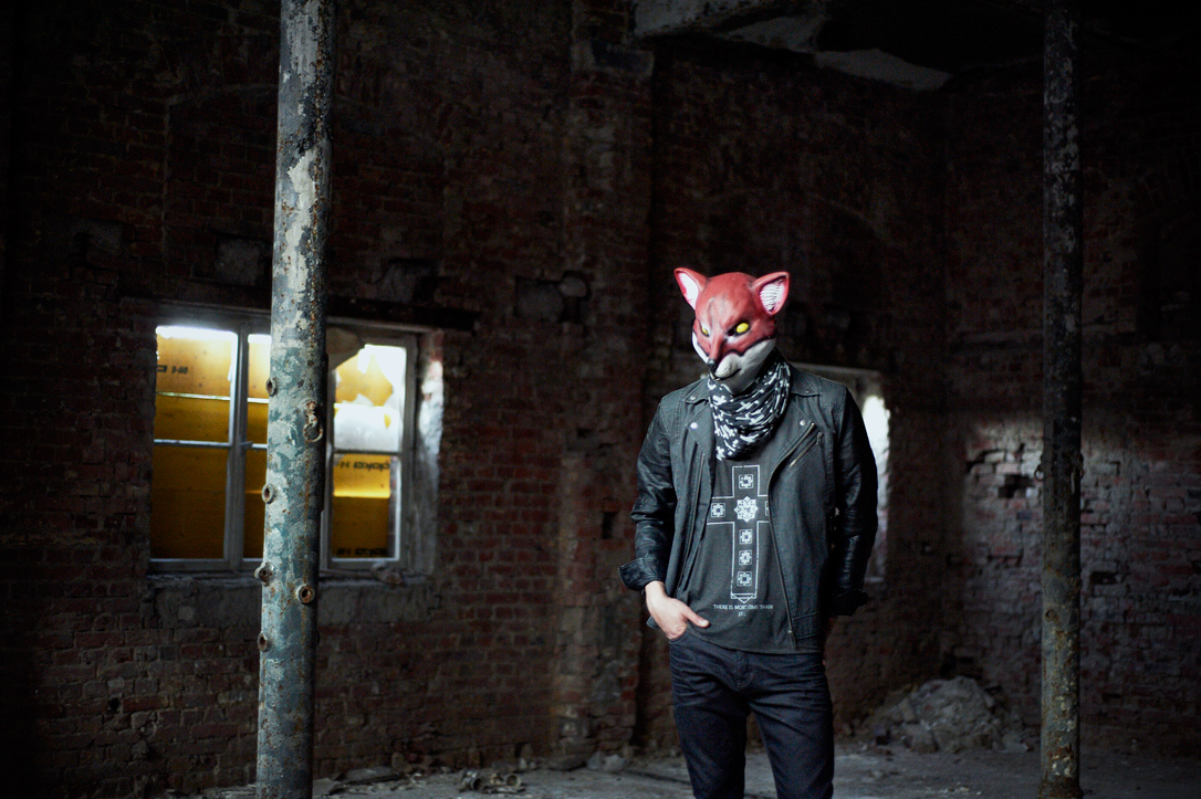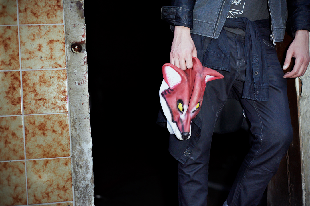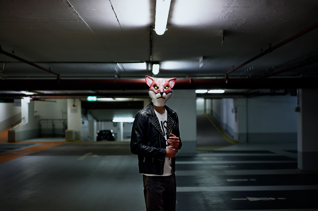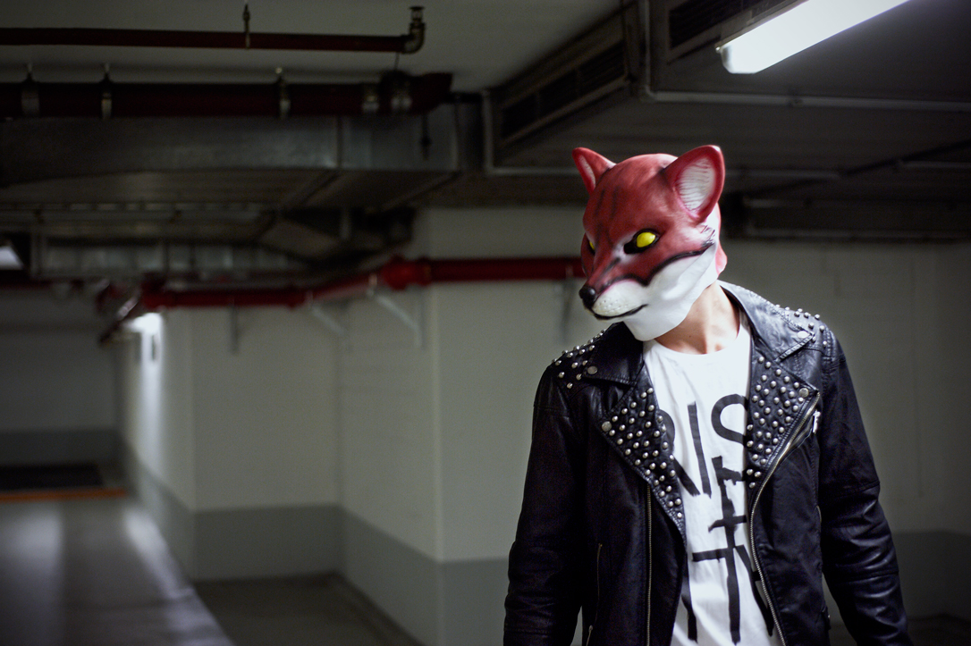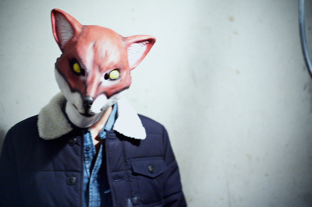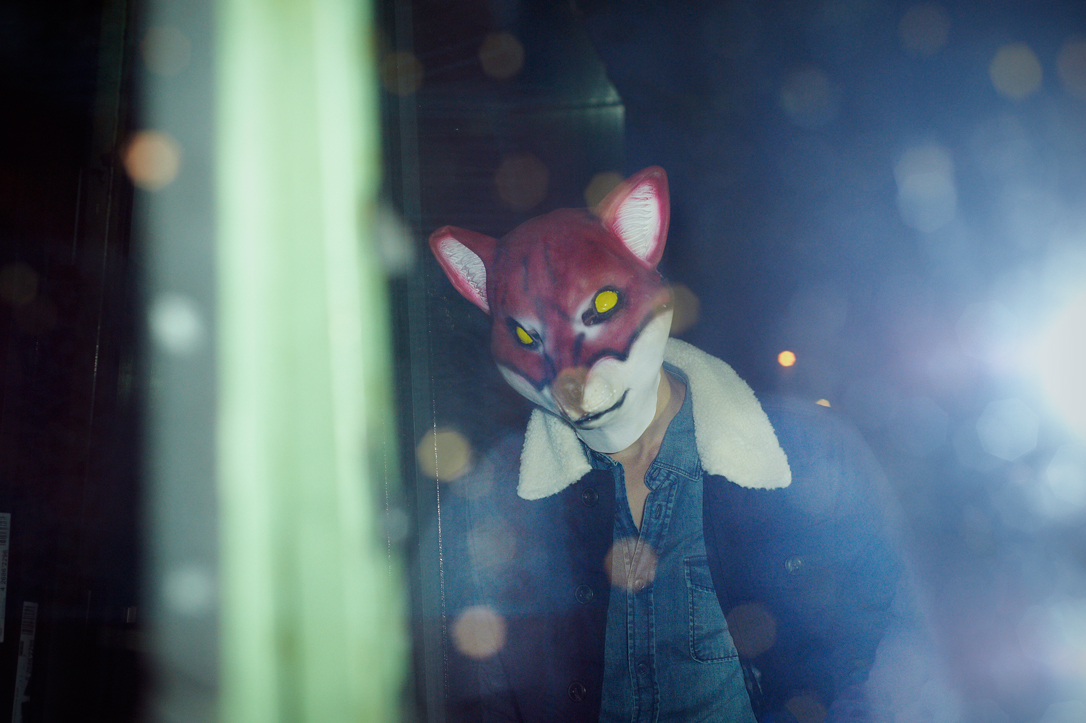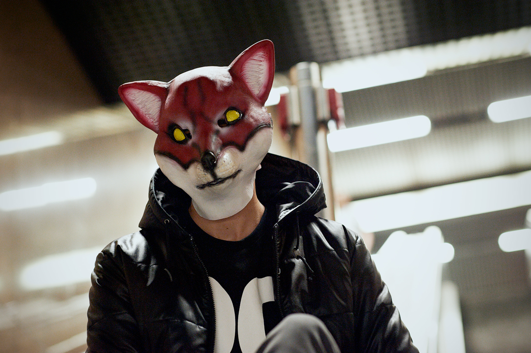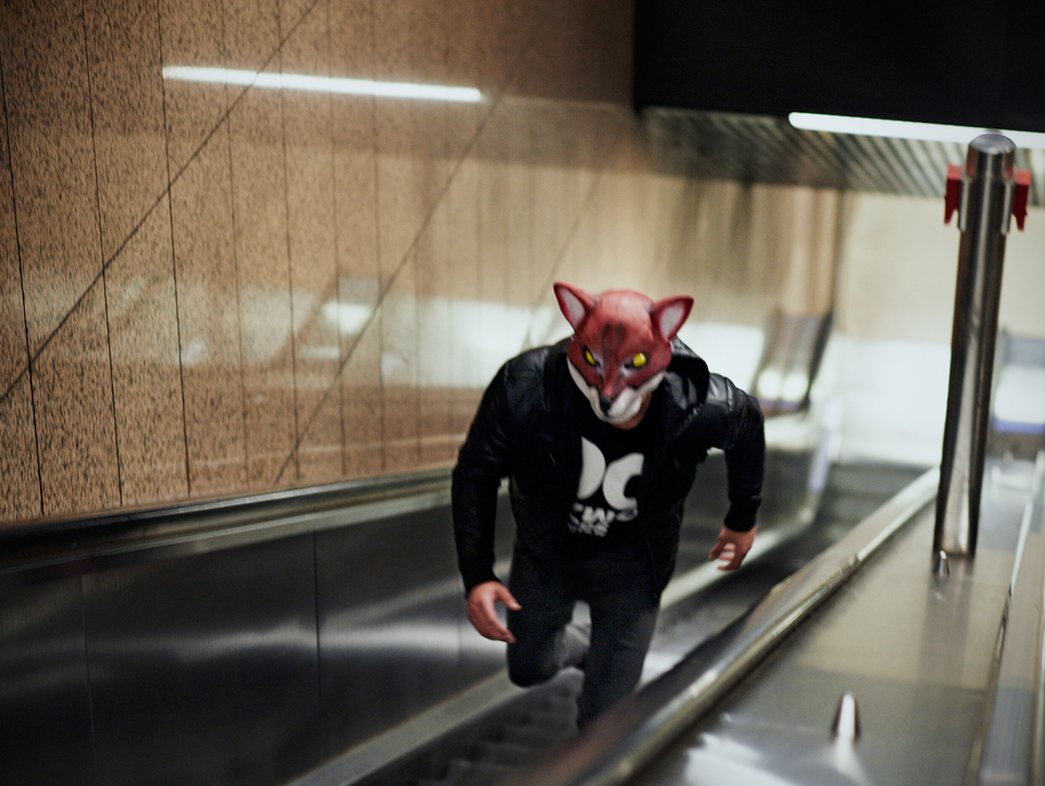 - A person wearing a fox mask and a black jacket is running up an escalator in a tiled indoor setting.